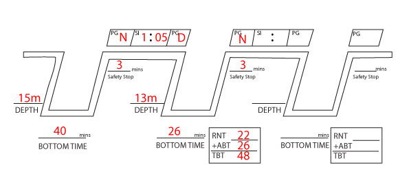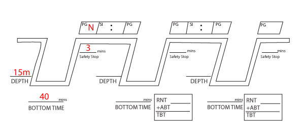 For this example we will be completing a dive profile for the following 3 dives. One of our goals will be to work out our Adjusted No Decompression Limit for the third dive, this will tell us how long we can stay down.