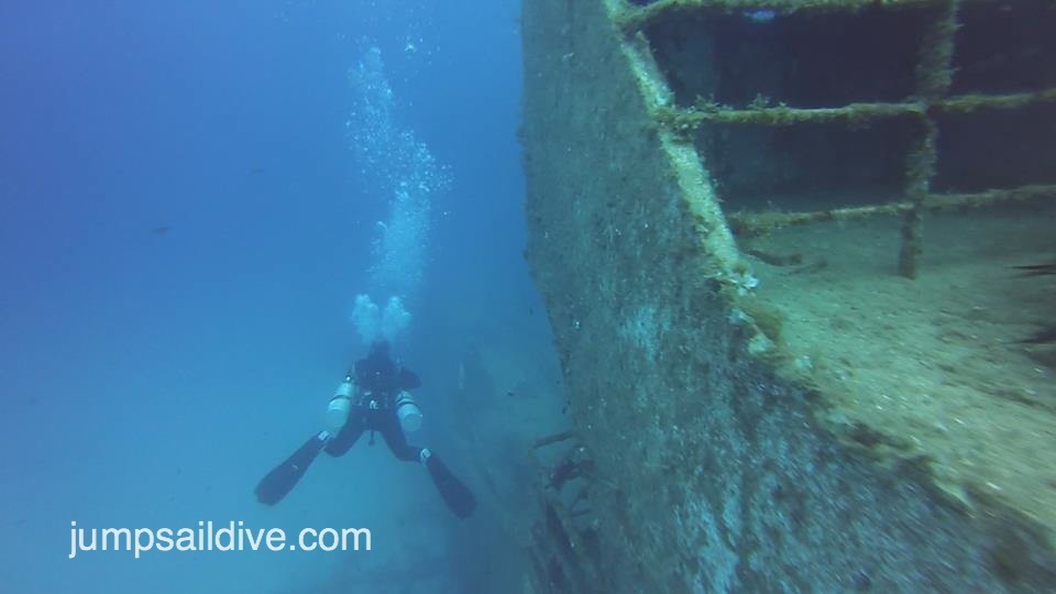 The Um El-Faroud is a fantastic dive. You really need to be an Advanced Open Water Diver or higher to do this dive and to get the most out of it as a recreational diver you need the Deep and Wreck specialities . Honestly, you need to be a tech diver to really be able to experience properly (as I am only as a recreational diver I am looking forward to experiencing it again when I have my tech qualifications). So back to the dive. This was the last dive that I did when I in Malta this summer. In some ways this dive was a graduation dive. Usually I would lead a dive with other instructors at the same site but this time I was on my own. As I decided to use sidemount, I had to come in early and set up my kit. The Razor Sidemount harness is a sidemount specific harness and it does take time to setup, so I arrived at the diveshop for 7am so that I would have enough time to weight myself correctly and make sure the van was packed. I only found out once Brad, my friend who was coming on the dive, turned up at the shop that we were the only two going on the dive. We quickly go ourselves packed up and left 15 minutes ahead of schedule. I had dived the Um El-Faroud twice before (once in October 2012 and the other in April 2013) so I had a rough idea of where it was but I didn’t really know where I was going. Obviously I had a map (no) and written down directions (only verbal), however I made it there in about 40 minutes. The dive site was practically deserted. There were only a couple of other divers there and we asked them about the dive. They told us that the visibility was terrible and there was a strong current. So undeterred we kitted up and entered the water. I have to admit that I was nervous. I was completely unsupervised. The dive shop was 40 minutes away.No one was watching but I had my best friend’s life in my hands. We descended to 10m and followed the reef towards the open sea. I checked the compass, corrected our direction, and left the reef behind. There is a statue on the way towards the wreck that was placed by a dive shop several years ago, I looked but I couldn’t see it. I crossed my fingers that I wasn’t going to miss the wreck. Then from the depths I saw a dark and murky shape…it was the Um El-Faroud. I signalled to Brad that we should descend further. We arrived at the stern, as we had planned to, and then started to explore. As Brad only had a 15 litre and that we were on our own, we had decided that we wouldn’t penetrate the wreck. So we bimbled around the wreck, making our way around the stern, along the port side across the hull and back up along the starboard walkway (our only bit of penetration). Once we had completed the circuit we had plenty of of air remaining and NDL so we went back and I messed around with my cylinders. Taking them off and squeezing through the railings. I then decided to go down and look at the propeller. I swam down towards it, turned and couldn’t see Brad. My heart skipped a beat. I turned back, looking frantically for him. What had happened was that he had been directly above me when I turned so I didn’t see him. Luckily I turned back and there he was. I gave him a look of “where where you”, he smiled. We then decided to end the dive as our NDL was getting low. We swam back to the reef and explored while we performed a swimming “deep” stop. Then made our safety stop next to the exit point. We quickly exited, packed up and headed back to the dive shop. It was a very freeing and exhilarating experience. I am glad I did it. I feel that due to the fact that Divewise put their trust in me I have become a better diver for it.