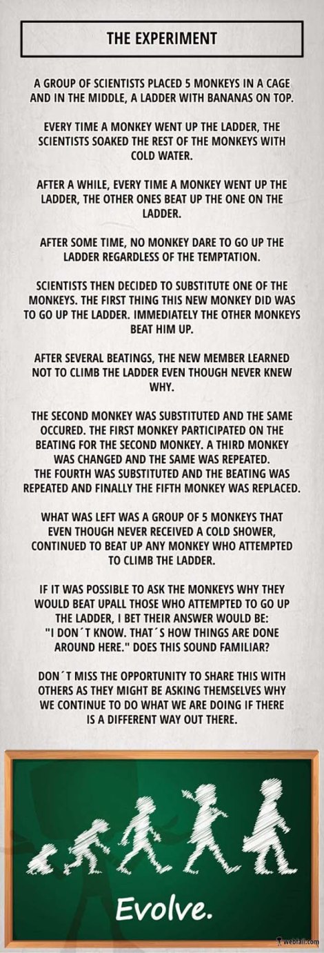 You might be wondering why I am posting about an psychological experiment involving monkeys on a blog that is about the extreme sports that I do diving, the reason is that to me this experiment is important. In life we do many things that without truly understanding the reasons as to why we do them.