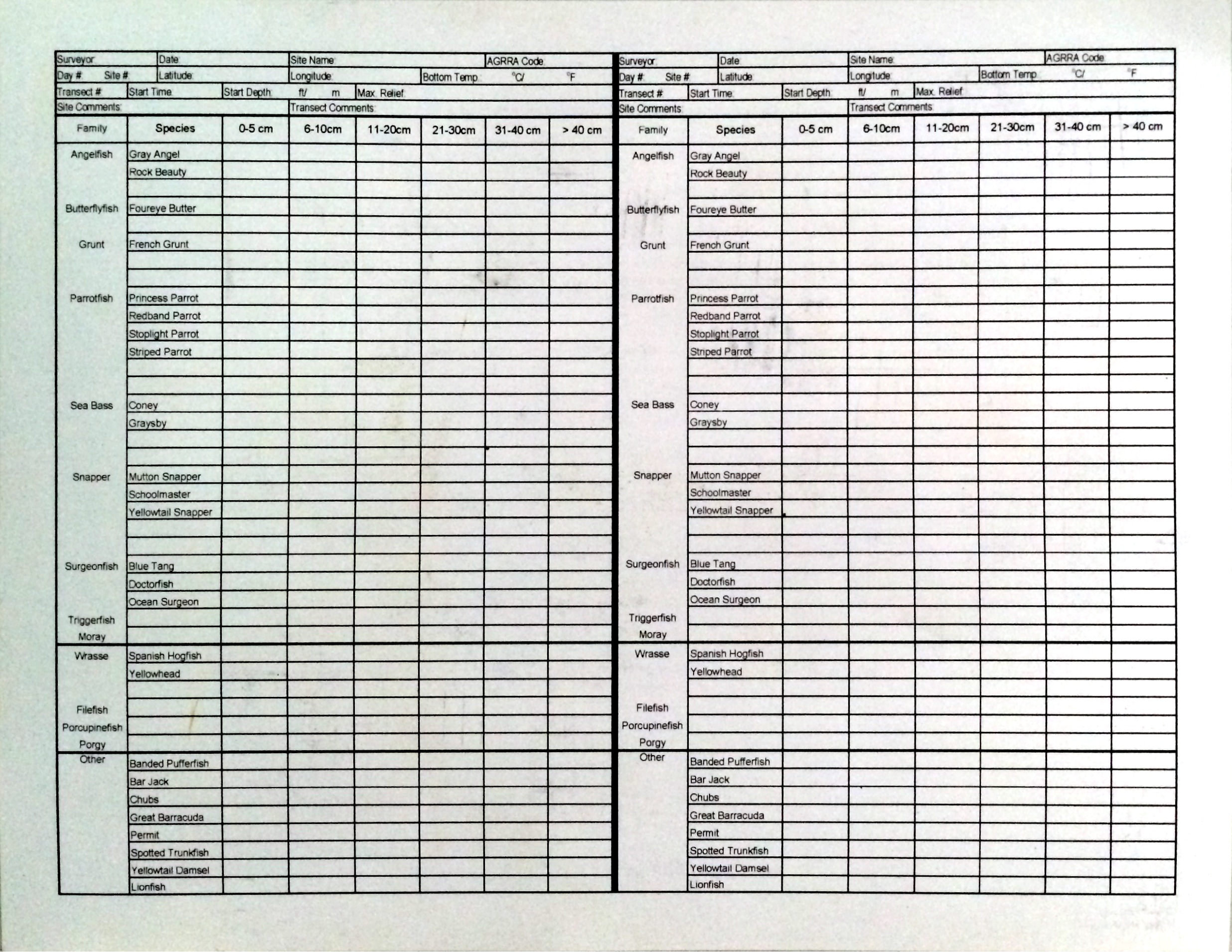 Day three started with another morning classroom session were we discussed what we were going to do for the day and we did some more Fish ID. After lunch we then headed out on the boat and started doing our first transects. The information for each transect was recorded on a slide (like that shown below). The slide had the most common fish to the area, that means that you have to add any that you see that aren’t on there – such as the Queen Parrotfish or the White Grunt. The idea is to swim along using the T-bar to help you size the fish and then you note the types on the slate, all the while letting out the tape measure so that you measure a distance of 30m (100ft). You are only to note the fish that appear 2 metres in front of you and a metre either side of the T-bar.