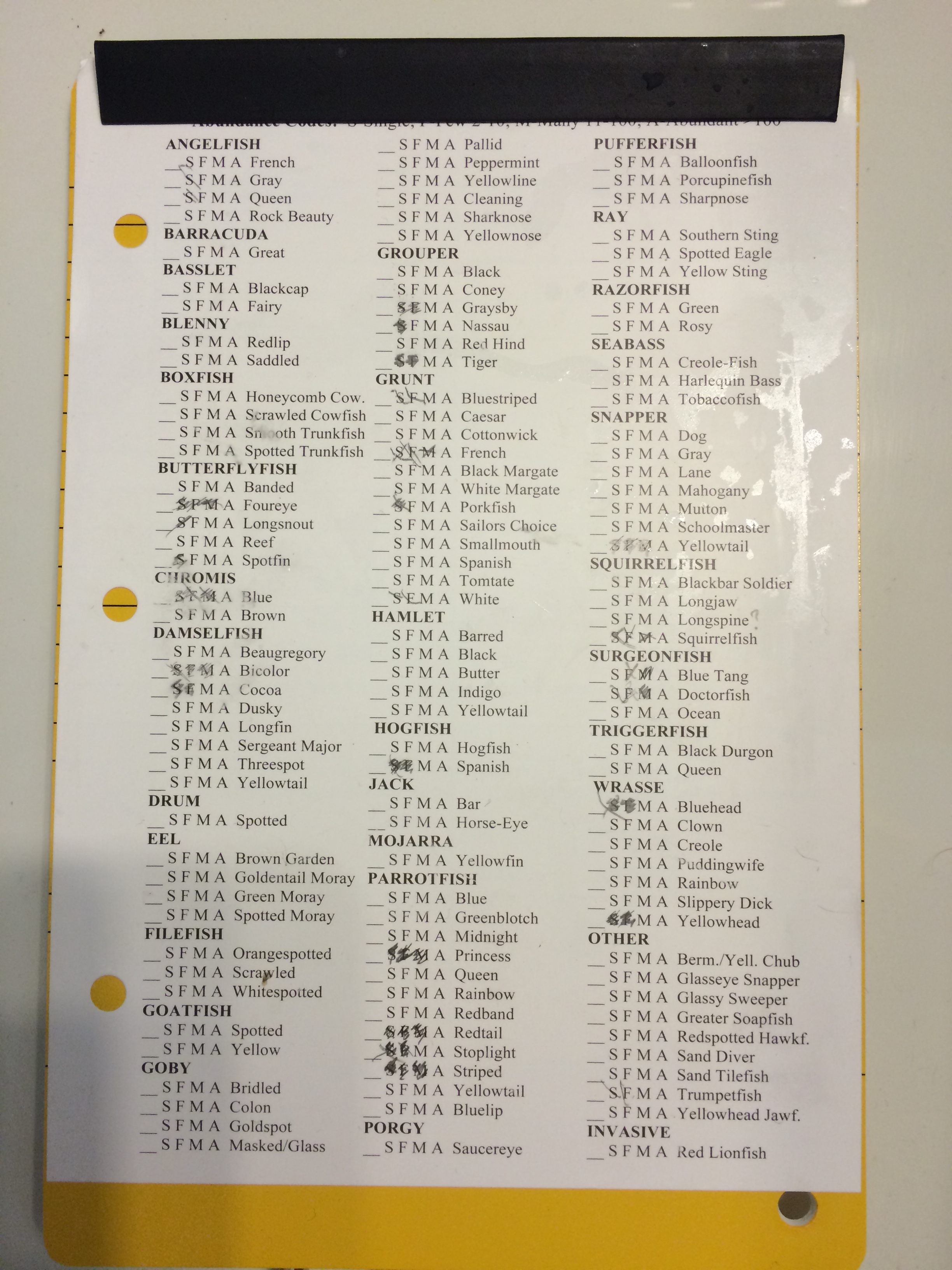 Once you know some fish you need a way to record them. Reef.org sells slates and recording sheets on their webshop. The pack that I have linked to even includes the option to buy a slate to help you identify the fish. Recording them is easy. Beside each fish name on the sheet are the letters S F M A.