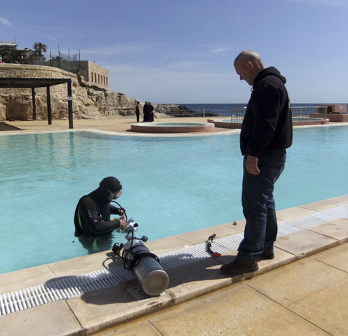 On the 2nd April 2013 I did a trial dive in sidemount. Alan Whitehead at Divewise/Techwise Malta helped me setup the Hollis SMS50, and after a briefing of how to don the equipment I went for a little swim around the pool. It was really different from what I was used to, but from that moment I was hooked.